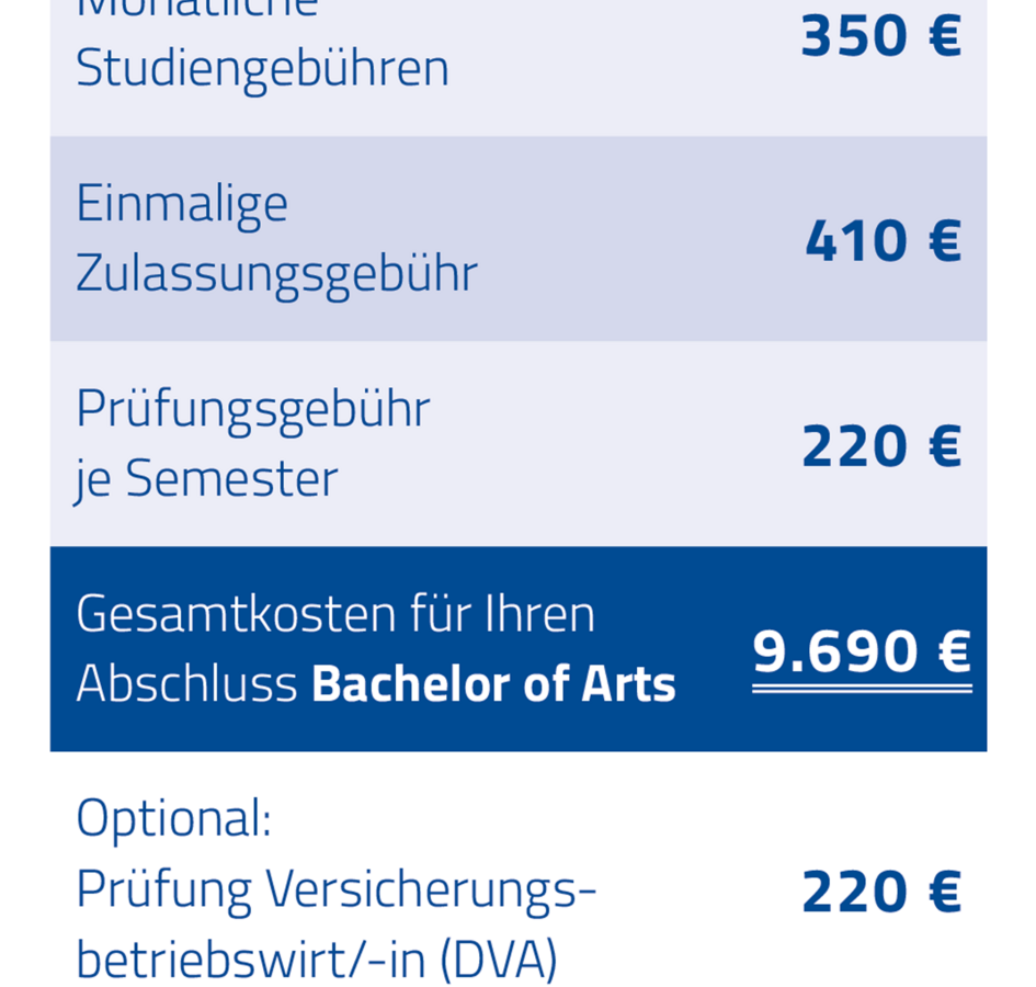 - Mit Vorqualifikation Versicherungsbetriebswirt/-in (DVA) belaufen sich die Studiengebühren auf 3.600 €.