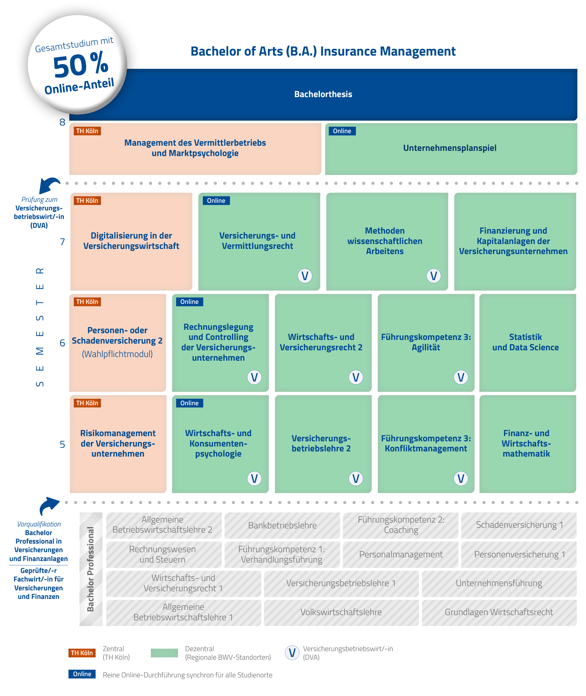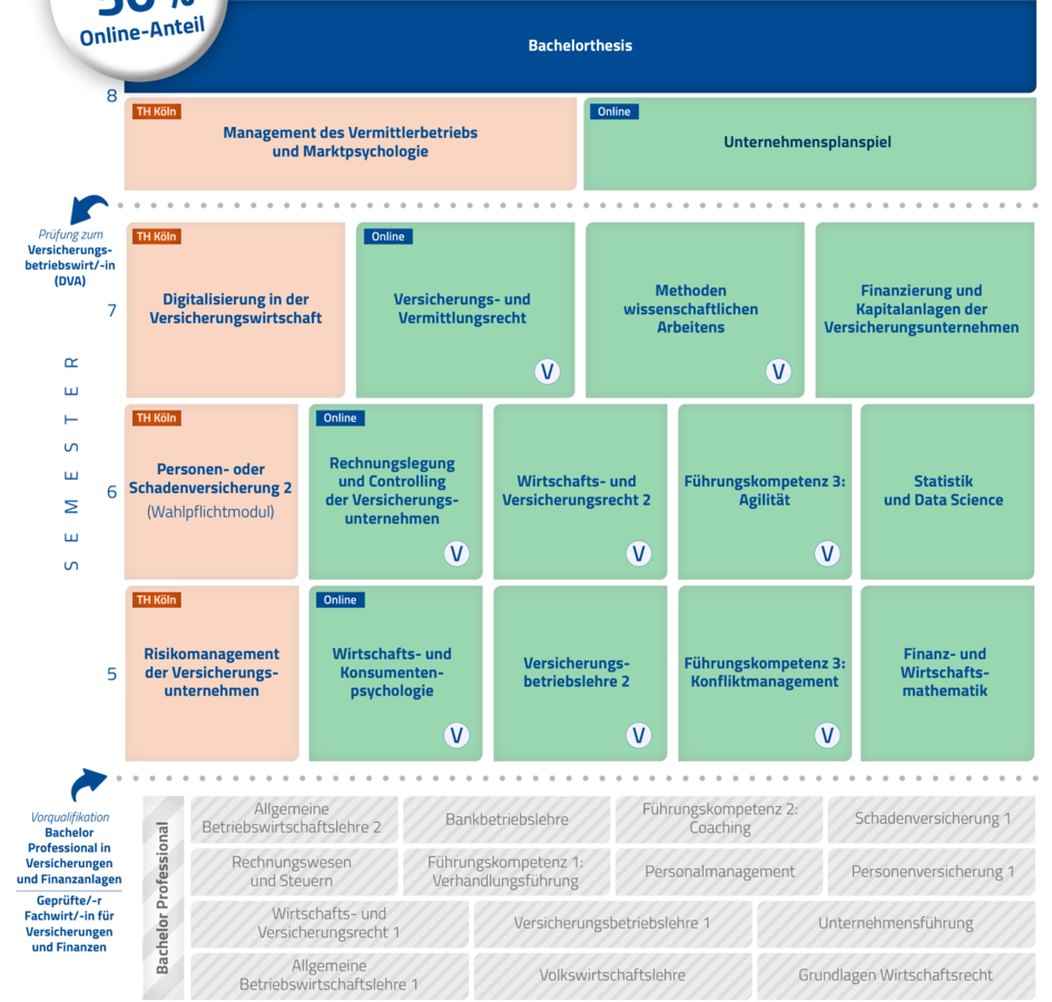 - Als Versicherungsbetriebswirt/-in (DVA) reduziert sich für Sie der Studienumfang auf acht Module und die Bachelor-Thesis.