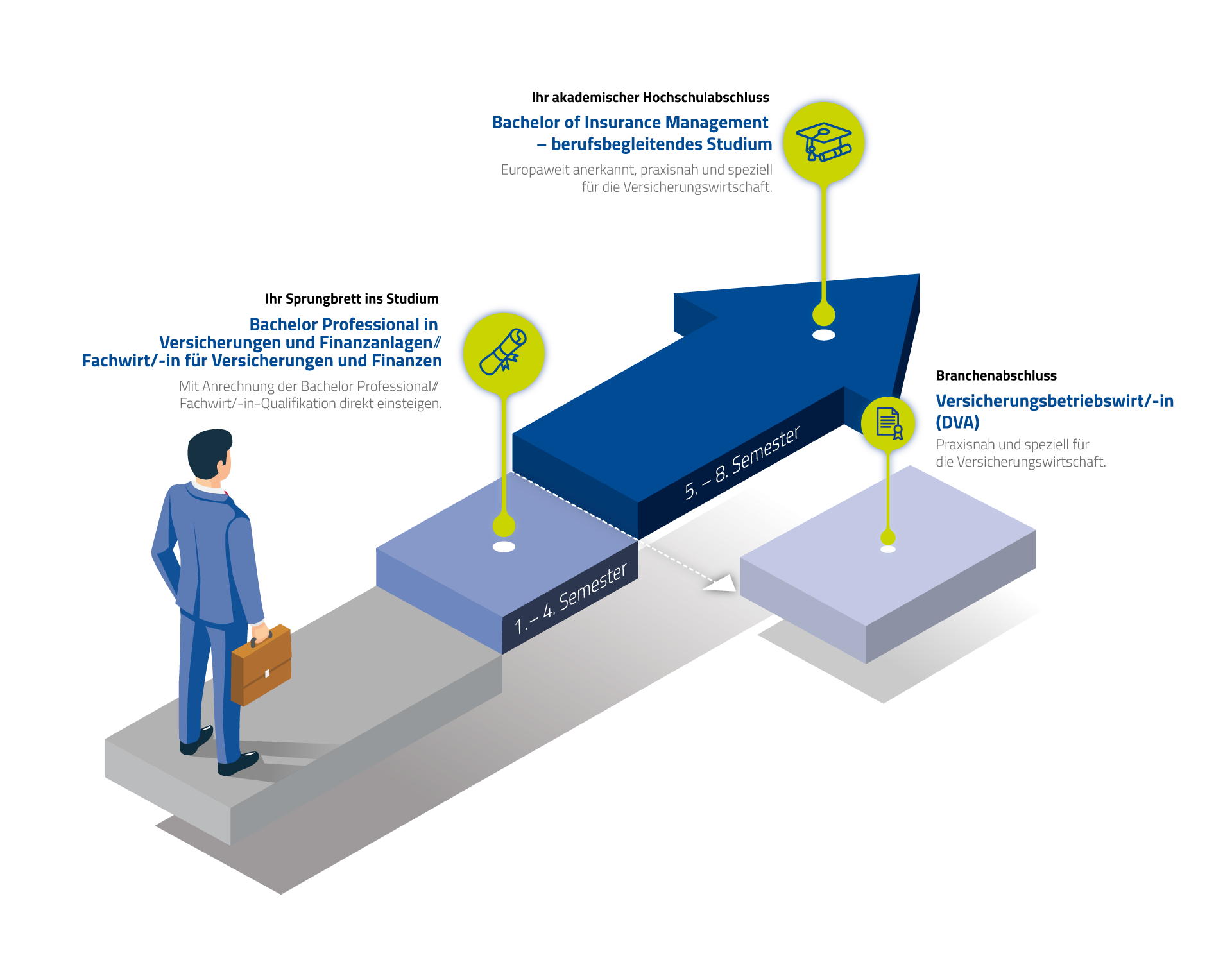 - Mit AbschlussBachelor Professional in Versicherungen und Finanzanlagen oder als Geprüfte:r Fachwirt:in für Versicherungen und Finanzen oder Finanzberatung können Sie direkt in das fünfte Semester einsteigen und den Abschluss Versicherungsbetriebswirt (DVA) nach drei beziehungsweise den Abschluss Bachelor of Arts nach vier Semestern erlangen.